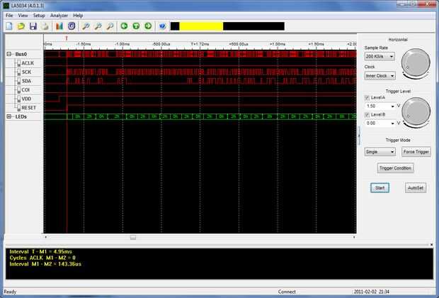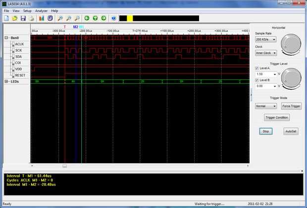 Lo que encontré es CVDD consigue encendido y poco después, CRST y CSDA suben al mismo tiempo exacto poco seguido de CSCK que pulsos. CSDA cambia el borde de levantamiento de la CSCK y supondré que consigue leer en el borde de caer.
