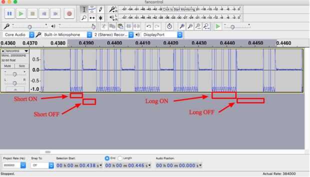Hay 4 horarios distintos en juego aquí y por mucho mirando a su alrededor y toma de muestras, podemos determinar que es no va más en sino patrones de en corto, corto apagado, en largo y largo apagado, que comprende el alfabeto básico de la señal de radio comunicación. Utilizando Audacity, seleccionando un intervalo y restando final la posición de la posición de inicio que selección, podemos determinar la duración de cada una de las señales: