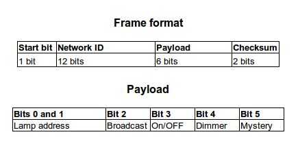Parece que los datos de carga útil tienen dos bits para la dirección de la lámpara, luego de 4 bits para datos de comando.