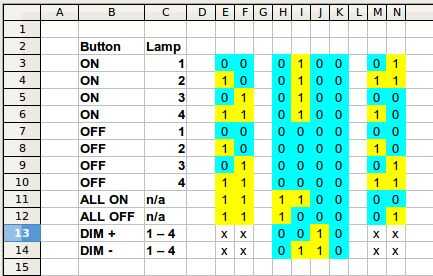 Para que sea un poco más fácil de depurar, he escrito todos los fotogramas capturados en OpenOffice. Salí hacia fuera de los primeros 13 bits, puesto que ya sabía lo que eran. También dejé algunas líneas para los botones DIM para que encajaría en la captura de pantalla en tamaño de la imagen de defecto de Instructables.