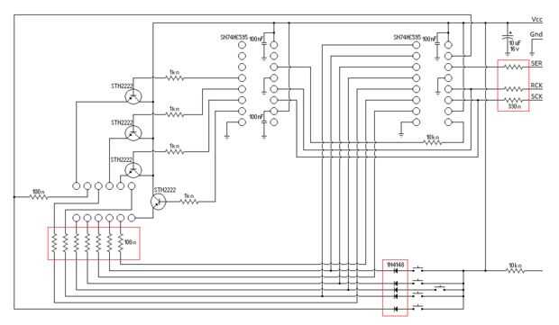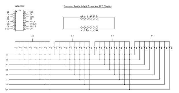Con el control de calidad de SN74HC595 se conecta al segmento a, QB conecta al segmento b, y así sucesivamente hasta llegar a QG para g. segmento QH conecta con punto decimal y QH' conecta con el segundo SN74HC595 a los ánodos de los dígitos individuales.
