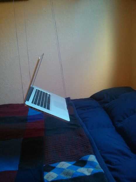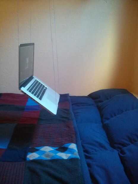 ¿Y si tu portátil cae... a quién le importa? Es sólo pulgadas de tu cama! Mejor aún, cuando no estás usando este increíble artilugio, puede simplemente tomar abajo las cuerdas y guardar en un cajón. Dependiendo de la rigidez de la cadena, es bastante fácil de bucle hasta los ganchos de nuevo.
