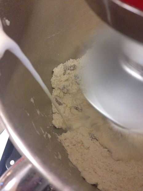 Esto se pueden hacer a mano también, simplemente frote la mantequilla en la harina, añadir el azúcar y las pasas. Hacer un pozo en el centro y vierta la leche. Mezclar con un tenedor y luego con la mano.