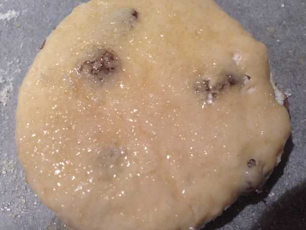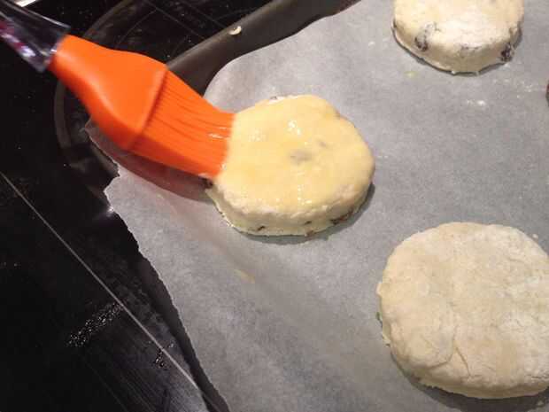 Pincelar los bollos con un huevo batido y espolvorear con azúcar.