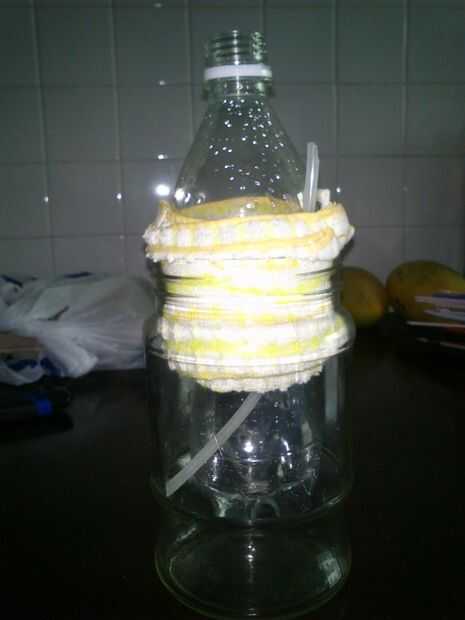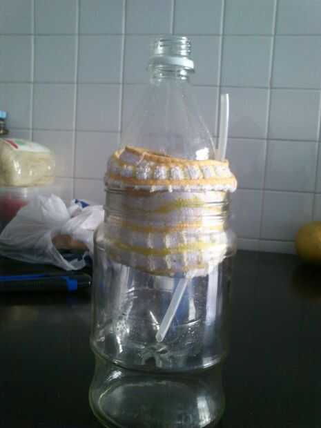 Quite la botella envuelta, llenar agua en la jarra hasta aproximadamente una pulgada debajo de la marca alto observado antes. Vuelva a colocar la botella en el vaso y ajuste apretado.