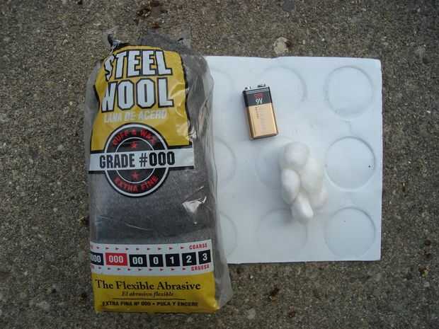 Lana de acero viene en varios grados. Se necesita un grado fino (delgado) para que funcione. He elegido grado 000. Otros grados pueden funcionar tan bien. He encontrado mi lana de acero en la sección de pintura de mi tienda local de Miejer por tres dólares. Estoy seguro de que esto podría encontrar en lugares como Wal-Mart, K-Mart o en cualquier ferretería.