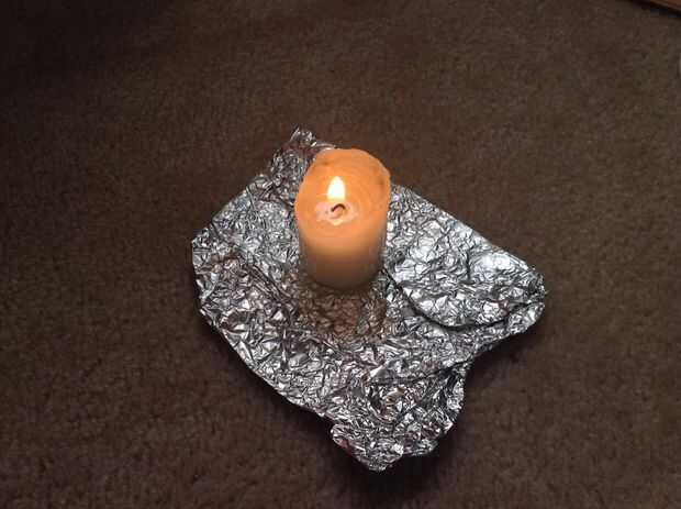 Encienda la vela en el fuego y deje que la cera se derrita durante 2-4 minutos. Me gusta poner la vela en el papel de aluminio para mantenerlo cera de la alfombra.