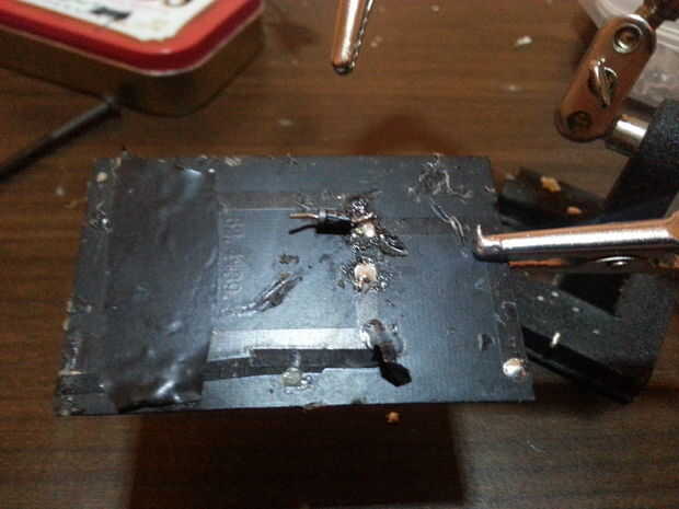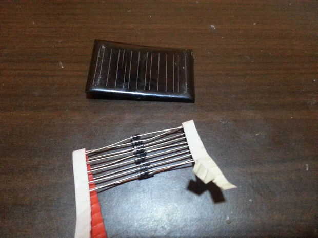 1-lata el diodo y la soldadura a la conexión positiva de paneles solares. Soldar el diodo para que quede hacia el lado con la línea de fuera. Ver mi foto.