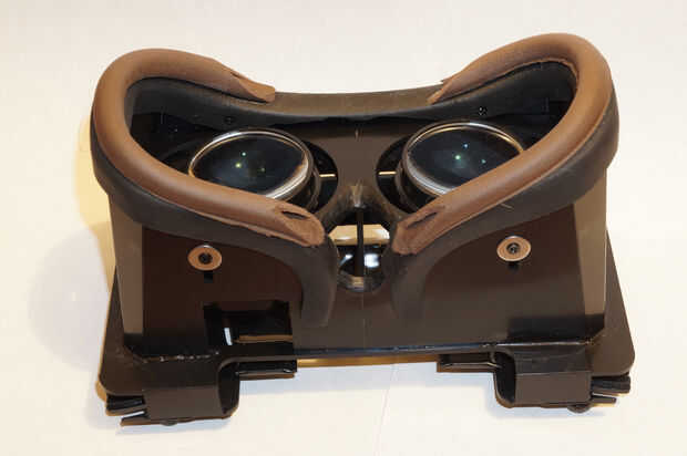 Encienda la maqueta de cartón de google y colocar el smartphone en el auricular para la línea de centro es debajo de la placa divisoria vertical en el auricular y la imagen está centrada arriba a abajo en el visor. localizar la lente de enfoque mecanismo y averiguar cómo funciona. Mi sistema tenía cuatro tornillos que se necesitan para aflojar y luego deslizar la bandeja de la lente. Mire el auricular asegurándose de que las lentes se alinean horizontalmente con sus ojos. Ahora se centran las lentes y hasta el se consigue la imagen más nítida con un buen campo de visión. Si su unidad es como la mía, apretar los cuatro tornillos procurando no cambiar el foco. Obtuve el mejor resultado con las lentes más cercanas a los ojos.