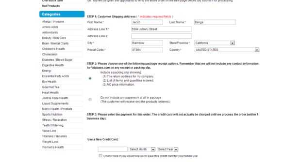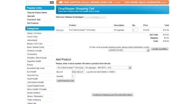 Ahora vamos a decir que Jacob Banga vive en la calle de Johnny 5694, arco iris, CA 97364, compró una botella de Tru C BioComplex. Una vez más, navegar al tu perfil de Dropshipping en su cuenta de Vitabase. Cuando esté allí, haga clic en realizar pedido DropShip. Encuentra Tru C BioComplex en la lista y haga clic en Añadir producto al carro. El costo total va a salir en $18,50 ($14 para el producto y $4,50 para el tarifa plana de envío). Ahora haz clic en "Continuar a envío y pago la información".
