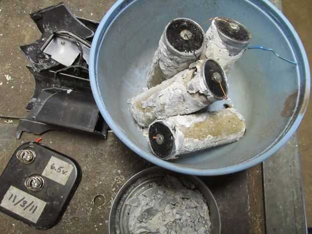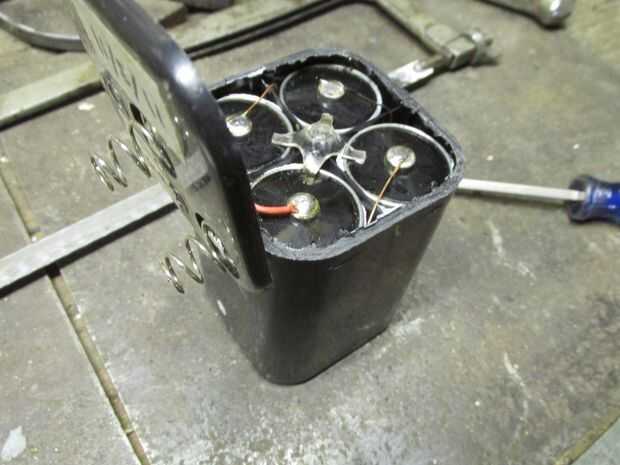 Consejo para la seguridad: Desarmar este tipo de batería es peligroso no exactamente, pero tienes que protegerte el electrolito cáustico dentro. A pesar de ser llamado "pilas secas", los compuestos dentro están húmedos con un electrolito que es duro en la piel y corroen cualquier cosa metálica que cumple. Usted debe usar guantes de goma (o de al menos unas pocas capas de bolsas de plástico) sobre las manos.