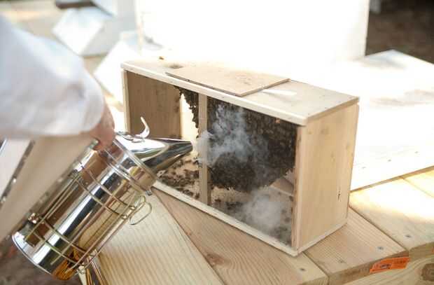 Manejar la caja de la abeja con guantes. Dar a las abejas un soplo suave o dos de humo. Demasiado hacen confundirse y atacar.