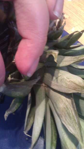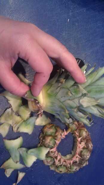 Eliminar algunas hojas, pocos mantenga lo suficiente como para la planta. Tenga cuidado con la cuerda de etiqueta perforada en el corazón de la cabeza de piña. Quitar las hojas hasta que no vea más agujeros y asegúrese de que las hojas son firmes y perfectamente sano con ninguna mancha marrón.
