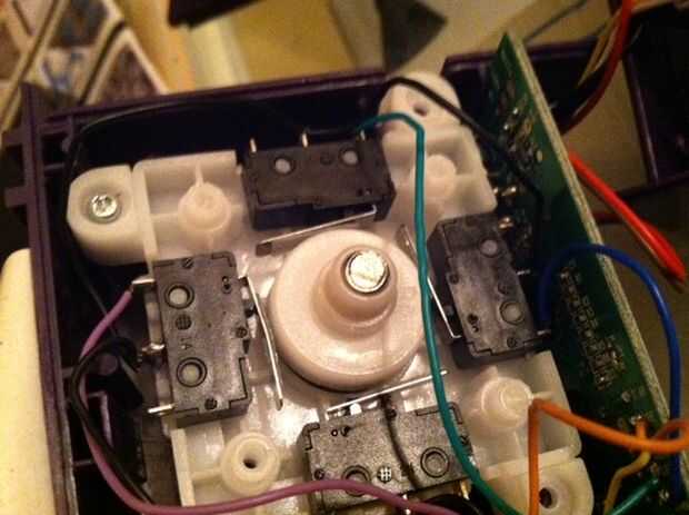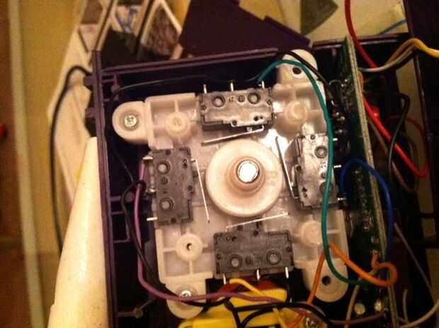 en la primera foto se pueden ver los interruptores de pequeño joystick sin shimmed. colocando un pequeño rincón de pegamento caliente o un pequeño pedazo de adhesivo del uno mismo de tefflon puede traer el interruptor superficie más cercana al cañón de joystick.