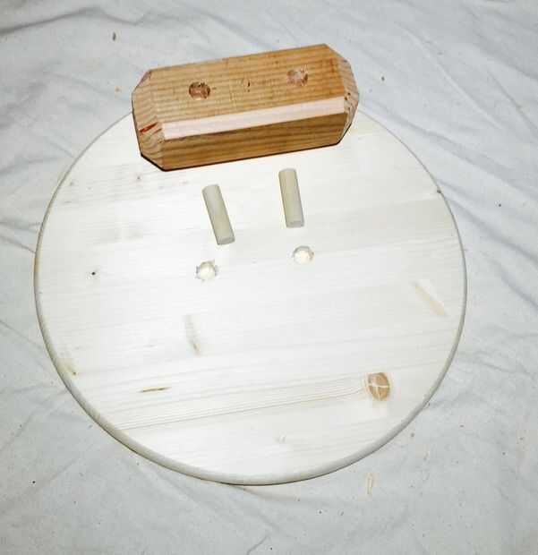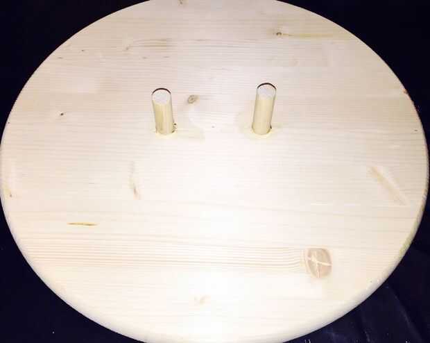 1. Taladre dos orificios de 3/4 de pulgada en el centro de tu mesa de 18 pulgadas redondo, 4 pulgadas aparte como se muestra en las fotos. Deberán estar alineados con los agujeros de cabeza de martillo perforados en el paso anterior.