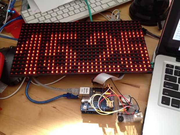- Una Pantalla de matriz de punto Freetronics, que es una matriz de LEDs de 16 x 32. Vienen en diferentes colores, pero usar rojo para subrayar que este gadget es para las notificaciones «críticas».