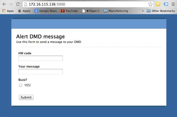 Cargar su sketch en Arduino, asegúrese de que está conectado a su red local. Si todo va bien, el Arduino encuesta el servicio web una vez cada minuto. Darle un mensaje para mostrar: en el campo de código de HW, escriba en el mismo ID se establece para la constante HW_ID en el bosquejo. Escriba cualquier cosa en el campo "Su mensaje" y comprobar la casilla de verificación "Buzz?".