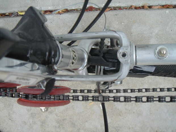 Es aquí una toma mirando hacia abajo en la horquilla era atornilladas en el bastidor y las ruedas de guía de cadena que hice de las ruedas de patín.