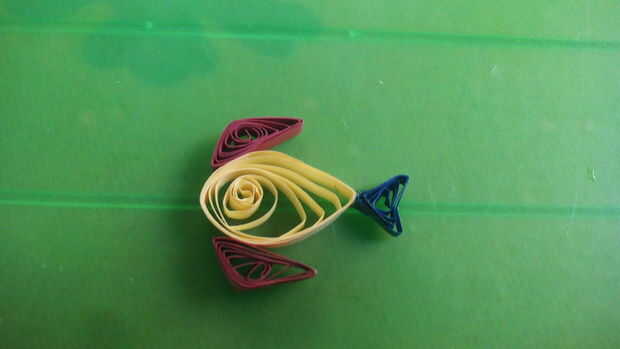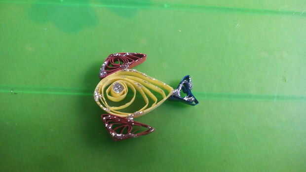 Una banda de papel y una lágrima. Tomar otra tira de papel y cortar en la mitad. Hacer dos suelta bobina con ambos. Después de que hacen las multas de los peces como cuadro con ambos. Tomar otro medio tira la aleta de la cola de los peces como imagen. La primera lágrima será el cuerpo de los peces. Pegar todas las piezas como se muestra en la imagen. Déjelo secar por algún tiempo y usted pescado está listo. Usar brillo para darle un aspecto hermoso. Además, puede Agregar un orificio llavero como el corazón para usarlo como llavero.