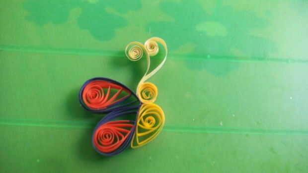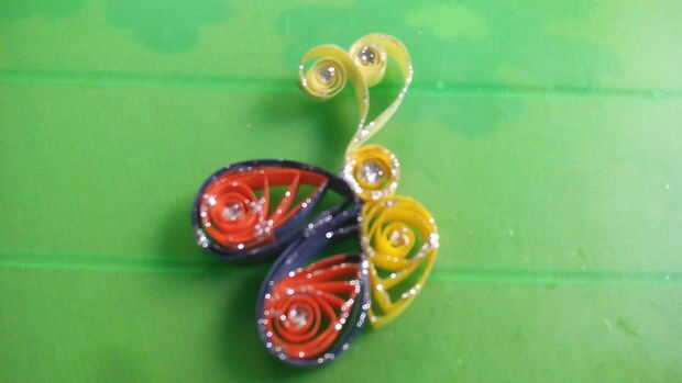 Ahora vamos a hacer algo diferente. Tomar la tira de dos colores diferentes y cortarlas por la mitad. Luego pegar los dos diferentes color mitad con pegamento (ver el cuadro). Ahora hacer una bobina suelta con la tira de nuevo y luego realizar una lágrima de. La lágrima tiene dos colores! Hacer otra misma lágrima de tamaño con el escariado tiras la mitad. Se trata de las alas de la mariposa. Tomar otra tira y cortar por la mitad. Con una mitad hacer un Marqués y con otros medio hacer un ajuste de la bobina (ver imagen). El Marqués es el cuerpo y la bobina apretada es la cabeza de la mariposa. Una tira de mitad y mitad. Rodar de un lado de cada papel y pegar en la cabeza como en la foto. El lugar todas las piezas con pegamento en el cuadro cuidadosamente y déjelo secar por algún tiempo. La mosca de la mantequilla está lista ahora. Utilizar algún brillo para darle un aspecto hermoso. Se puede utilizar para llavero, colgante.