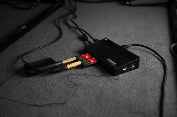 Para nuestra configuración (ver en el vídeo), ponemos un micrófono de escopeta en una mesa pequeña en la esquina que enfrenta nuestro sofá y gota de espuma de memoria que la gente comúnmente se reúne alrededor. También tuvimos algunos micrófonos de solapa extra que tenemos instalado al frente de cada uno de nuestros ordenadores, ya que sabíamos que sería estar sentado frente a ellos muy a menudo.