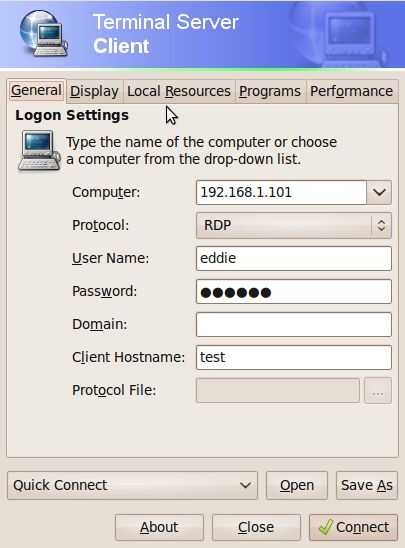 En segundo lugar necesita tener un equipo remoto que tiene un cliente de terminal server. ADVERTENCIA Si tienes control remoto en su máquina xp y alguien es iniciar sesión, iniciará la sesión les hacia fuera. Así que tienes que conseguir uno de los parches o software comercial en la web para conseguir alrededor de esto. Por razones legales, decido no incluir esta información.