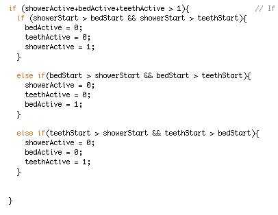 En esta sección se suman todos los ints de activación y si el resultado es mayor que 1, tiempo de ejecución más de una está activo al mismo tiempo. Si este es el caso entonces se comparan los tiempos en que se iniciaron los tiempos de ejecución y el tiempo de ejecución con el mayor número (el uno que empezó pasado) se mantiene activado. Usted tendrá que añadir cualquier tiempos de funcionamiento adicionales a esta sección pero mirando el código que existe ya debe ser bastante autoexplicativo.