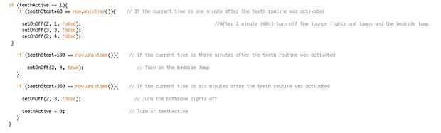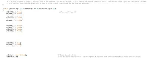 La siguiente etapa se ocupa de botones que, cuando se presiona, afectará a más de un zócalo del enchufe (por ejemplo, encender o apagar la TV, Xbox y sistema de sonido o las luces de encendido/apagado de entretenimiento). Para estos usted sencillamente han más de un "switchOnOff" del término (ver ejemplos de esto ya en el código).