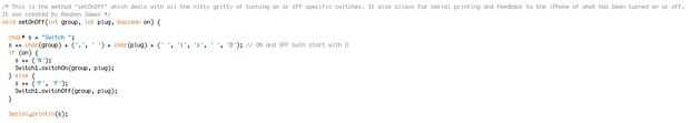 Esto llama a un método llamado "setOnOff". El código para esto se puede ver en la parte inferior del boceto. Se encarga de encender los dispositivos y apagado y para la retroalimentación a través del puerto serial. La disposición del código es: