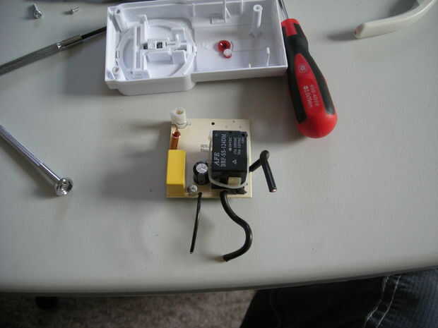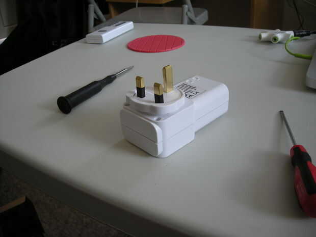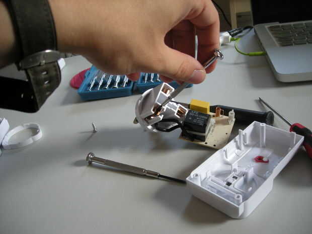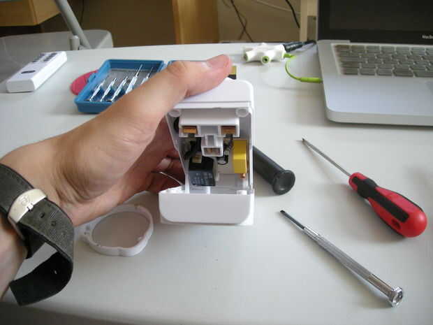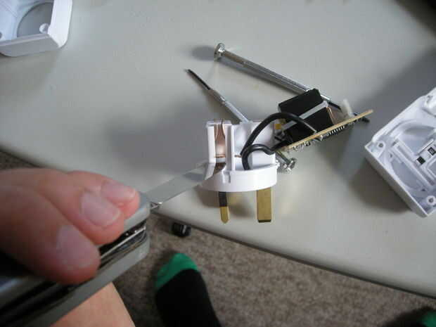 Usted tendrá que desconectar los tres cables de los tres terminales (puede ser un número diferente para los diferentes países: Supongo que Estados Unidos tendría sólo dos). La forma más fácil de llegar a los cables gruesos es deshacer el pequeño tornillo en el terminal de mano derecha (un pequeño flathead debe hacer el trabajo). Entonces puede utilizar un destornillador plano para levantar la mitad superior de la parte inferior media.