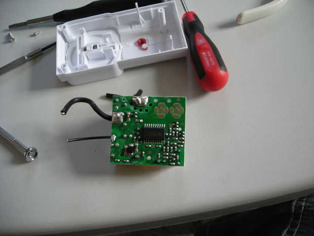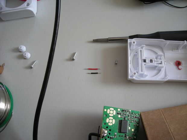 La parte que nos interesa está en la parte conectada a la pequeña placa de circuito. No toque el tornillo en el plástico que cubre en la parte superior izquierdo del tablero. Esto es parte de las antenas y moverla, incluso ligeramente, puede tener efectos enormes en la gama.