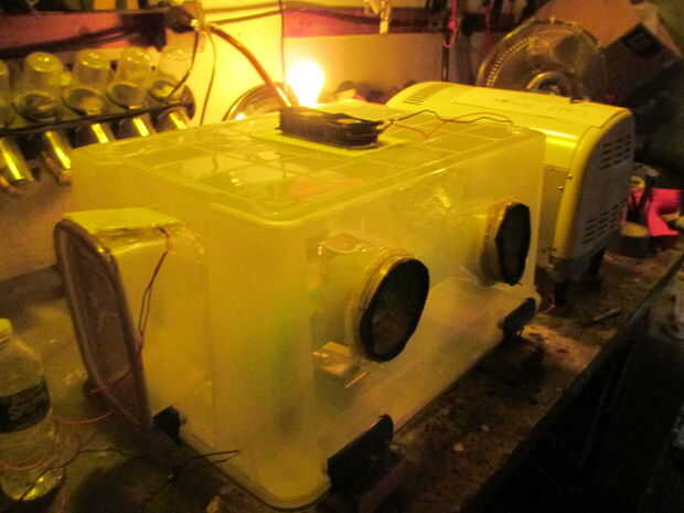 3. después de cortan una abertura en la parte superior y parte inferior o ambos lados de su contenedor plástico grande para filtros hepa y los aficionados. Desea que el aire fluya a través del filtro en el recipiente, luego vuelve a salir a través de otro filtro. Garantizar mediante pegamento/silicona caliente. Debe haber una constante brisa pequeña a través del contenedor y recomiendo dejando los ventiladores.