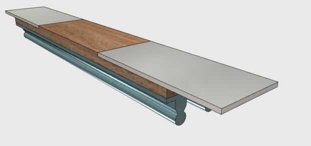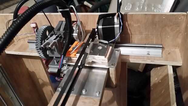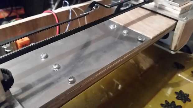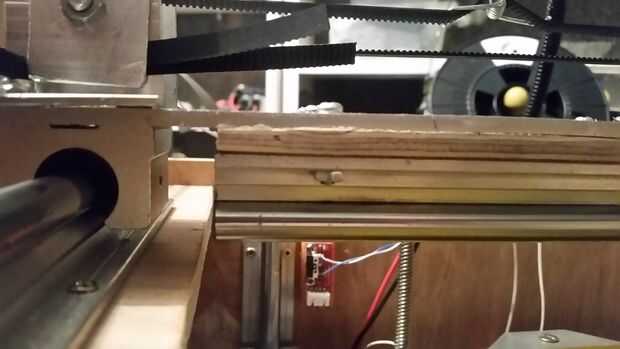 Diseño: El eje Y frente y parte posteriora a lo largo de dos URL apoyado rieles y lleva el carro de X. El eje Y es esencialmente un largo tablón que sostiene los dos rieles de X y se conecta en cualquiera de los extremos a los rieles Y. El objetivo de diseño para esto era "Z-altura" tan bajo como sea posible y mantener el centro de gravedad por debajo de o equivalente a los rieles. Decidí utilizar madera contrachapada como el "back bone" de esta pieza ya que no tengo suficiente aluminio de una pieza de aluminio completo. Utilicé aluminio en los extremos para colocar los rodamientos, motor X y X polea.