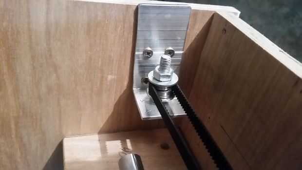El lado izquierdo tiene otra Y teniendo por debajo, una X teniendo y fijación Y cinturón. Los rodamientos Y son el mismo son los otros, 4 hundido contra los pernos. La correa de X teniendo el soporte y el accesorio de la correa Y son un montaje. La polea está hecha de dos rodamientos con bridas 3, 5 mm y está montada sobre un tornillo entre a soportes de aluminio L. Cada soporte en L se une por un perno a la compañía Y. Los dos rodamientos se deslice sobre un poco de cinta aislante entre dos tuercas en el centro del perno. Cuando se aprietan las tuercas de la cinta aislante es aplastada y se expande en diámetro sosteniendo los cojinetes en su lugar. La correa Y se lleva a cabo en lugar por una placa de aluminio en la punta de este tornillo. El diseño también es bastante pobre. Yo se actualizar a una parte impresa poco. ¿Cuántos cojinetes?: utilicé una a cada lado; Esto fue un error. Esto funcionaba bien para el eje X pero con la distancia entre los rodamientos en el eje Y, es un poco demasiado slop. El lado sin banda tiende a vibrar un poco demasiado. El diseño tiene mucho espacio para dos rodamientos por lo actualizará más adelante. Reduzco el slop algunos apretando los rodamientos. Hay pernos hexagonales llave de dos lados de cada cojinete para apretar el juego en cada dirección.