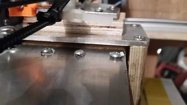 Cuerpo principal: Para reducir su altura, encaja el aluminio en la madera contrachapada por recortar la parte superior de 4 mm de madera contrachapada en cualquiera de los extremos. Usé una sierra circular para cortar arboledas de 4mm en el extremo y un cincel para limpiar todo. Usé los pernos para las guías lineales para unir todo. Sujeta las piezas juntas y marcados y perforados los pedazos juntos. Utilicé tornillos de 15mm M3 y tuvo que cortar los extremos con un dermel porque eran demasiados. He utilizado un trozo pequeño de aluminio para proteger el ferrocarril mientras que corte en el caso de se deslizó o la broca capturados.