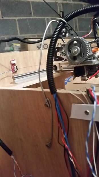 Gestión del alambre: porque tienes los cables a las piezas en movimiento que necesita algo para mantenerlos fuera del camino. Tuve algunos hilos del telar en una caja por lo usé para mantener los cables juntos. Tengo dos paquetes; pasando al eje de Y para la parada de motor y al final del eje de X y va al eje X para el estirador, extremo caliente, ventilador y termistor. En cualquiera de los extremos de los telares usé un gancho de ropa metálico vertical y doblado como un gancho para mantener los cables en su lugar. Yo no he hecho nada con los cables en la parte de atrás en este punto.
