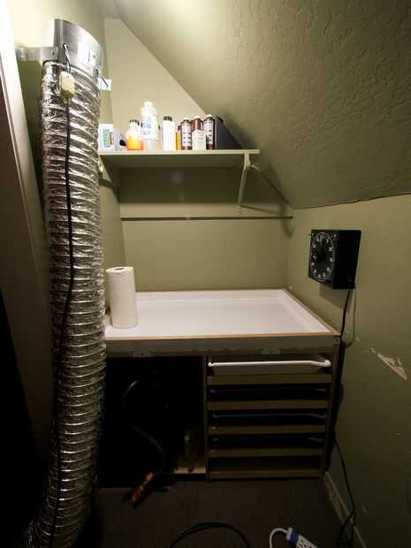 Cuando empecé este proyecto, mi recurso más importante ha sido El nuevo manual de cuarto oscuro. Está lleno de información sobre todo lo que necesita construir un cuarto oscuro de la tierra. El único problema era que tenía grandes sueños. Mi closet es sólo de 3.5 pies por 7 pies, pero yo quería imprimir tan grandes como 16 "x 20". He buscado ampliamente para ideas de ahorro de espacio, y el tema recurrente parece ser una escalera de la bandeja, como este.
