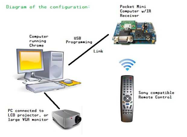 Las obras de instalación le gusta esto: (consulte imagen dos.) Mi control remoto universal envía señales de IR a mi microcontrolador. El microcontrolador envía comandos para controlar que el navegador del PC sobre él es la programación de cable como un ratón o cambiando páginas dependiendo de qué botones pulsar el mando a distancia. He visto controles remotos que son compatibles con equipos PC como un ratón opcional, pero esta configuración es un avanzado sistema de control que nos permite enviar cualquier controles de datos a la PC. El sistema que estamos construyendo permitirá el control remoto para actuar como control de ratón y software con un montón de espacio para sus propias mejoras.