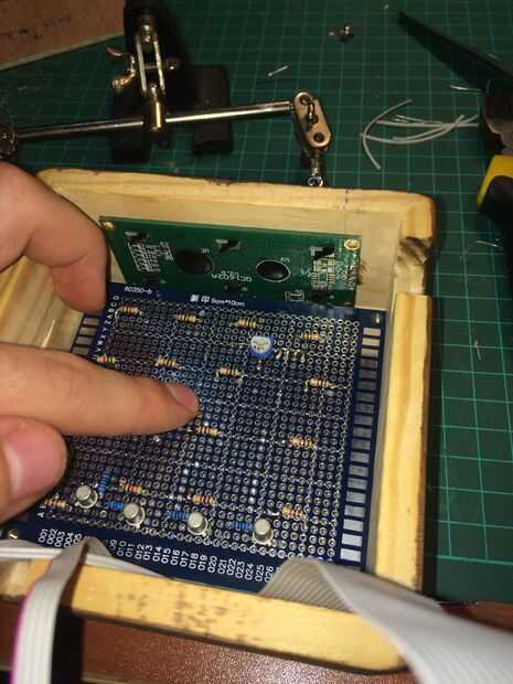 Después de realizar todos los componentes y poner el spacers(standoff's) en la madera así que tenemos espacio para todos los cables del L.E.D y LCD incluyendo los cables de los aburridos a arduino. Estamos dispuestos a encajar cada cosa.