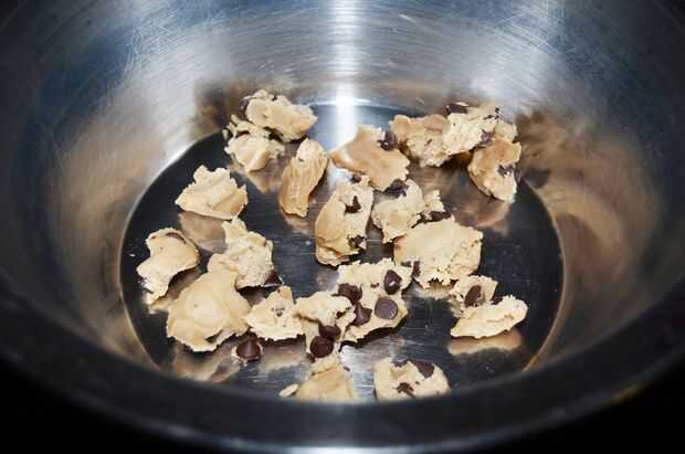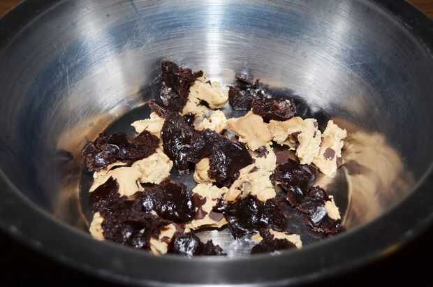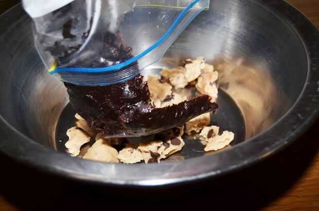11. ahora Vierta la mitad de una bolsa de la mezcla de brownie semicocido en el tazón de fuente y también romper en pedazos. (Nota: sólo una de las bolsas de mezcla de brownie semicocido utilizamos en esta receta. El otro bolso se puede utilizar para otro lote.)