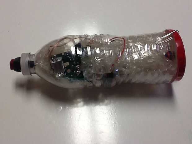 Ahora asumiendo la Granada pasó la prueba estamos listos para terminar la Granada. Primero algunas burbuja envuelve la parte inferior la botella de agua y hasta la tapa. Ahora ponga el circuito en y asegúrese de que el flash está a la derecha junto al lado de la botella de agua para que puedan mostrar. Poner de más abrigo de burbuja para que no se mueva de lado a lado en la botella de agua. Ahora poner en el soporte de la batería y más abrigo de burbuja hasta el fondo de la botella de agua. Ahora toma un vaso grande de plástico y cortar la parte inferior. Corte un pequeño agujero en la parte inferior y poner el conmutador en y asegúrelo. Ahora sujete la parte inferior de la taza a la botella de agua. Yo utilicé clips de papel aunque se puede utilizar a todo tipo de cosas. Opcionalmente puede Agregar aletas por lo que tiene una mejor oportunidad de apuntando hacia abajo y golpear el interruptor pulsador/momentáneo directamente cuando está lanzado a continuación. Ahora encienda el interruptor y esperar 10-20 segundos. Gire el interruptor de palanca y tire el interruptor pulsador/momentáneo golpea la superficie primero y debe apagarse el flash.
