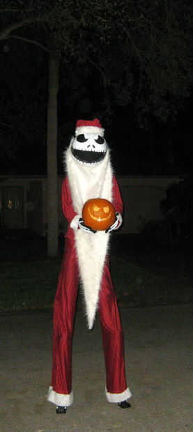 Este año hicimos Santa Jack Skellington. La máscara fue hecha desde un globo de lámpara de acrílico de 12" de The home depot y la boca fue cortada y pantalla fue agregada para llenar. Nos jodidos en un casco para que sea cómoda de llevar alrededor de truco o el tratamiento de la máscara. Fueron pintados los ojos, nariz y costura en.