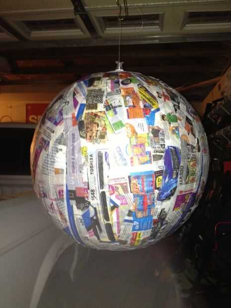 Tomar una pelota de playa de 24" y totalmente inflarla. Atar alguna cadena o línea de pesca (prueba de 20 libras) en la válvula de la pelota de playa para colgarlo. Luego tomar su cola y la harina y mezclar con agua tibia en el tazón. Yo uso pegamento de 1/4 taza, 1 taza de harina y un litro de agua tibia. Tomar tus tiras de periódico y sumergir en la mezcla. Yo prefiero usar los anuncios de semi brillante ya que mantienen mejor cuando está mojado. Deje las tiras a saturarse y luego tocan suavemente el exceso de humedad. Comenzar a colocar las tiras en la bola de playa trabajando desde la cima hasta el fondo en un criss cross patrón para la fuerza. Asegúrese de que deja sobre un 6" apertura en la parte superior de la bola de playa, por lo que se puede quitar más adelante. Hacer sólo 1 capa llena a la vez y déjelos secar en el medio. Si haces más de 1 capa puede correr el riesgo de que se convierta en demasiado caldoso y cayendo a pedazos. Continúe este proceso hasta que tenga 8-10 capas construidas. Muy importante: Controlar el nivel de inflación de su pelota de playa una vez que las capas comiencen a secar! Usted debe desinflarla un poco cada vez para evitar la expansión y explosión posiblemente su proyecto.