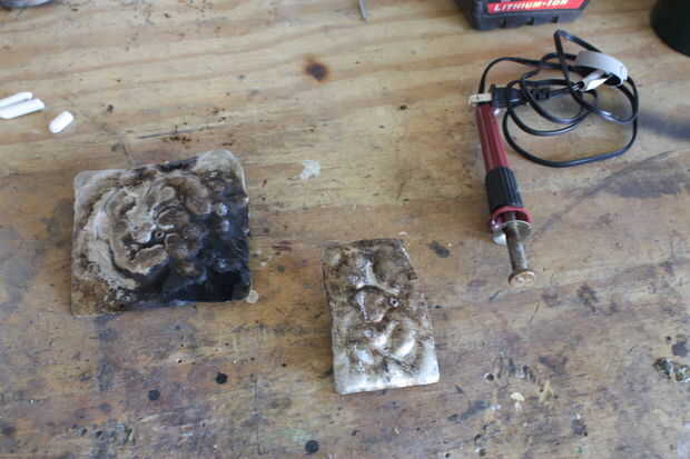 Tocar ligeramente el sello a la piedra de la tumba para quemar la textura en él. Se superponen su sellado y cuando la herramienta se enfríe, la calor hacia arriba.