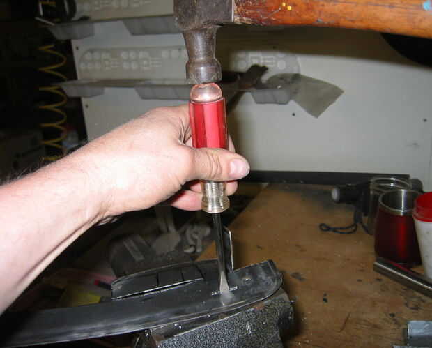 tengo la suerte de tener amigos que moler mis destornilladores afilados para hacer cinceles buena. Usar algo como eso para cortar el metal entre los orificios. Cuando la ranura es suficientemente grande para una hoja de sierra puede vio la ranura más grande.