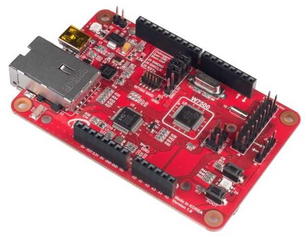 WIZnet WIZwiki plataforma basada en la de WIZnet MCU. WIZnet WIZwiki-W7500 es una placa de la plataforma de WIZwiki basada en W7500. El chip W7500 IOP4IoT es solución de un chip que integra un brazo Cortex-M0, 128KB de Flash y cableado TCP/IP base para plataforma de aplicación incorporada varios especialmente internet de las cosas. Si utilizas WIZwiki-W7500, usted podrá fácilmente desarrollar un prototipo. Es compatible con Arduino Shields. Esto es usando la escritura de firmware fácilmente disponible USB CMSIS-DAP y cabecera de ISP.