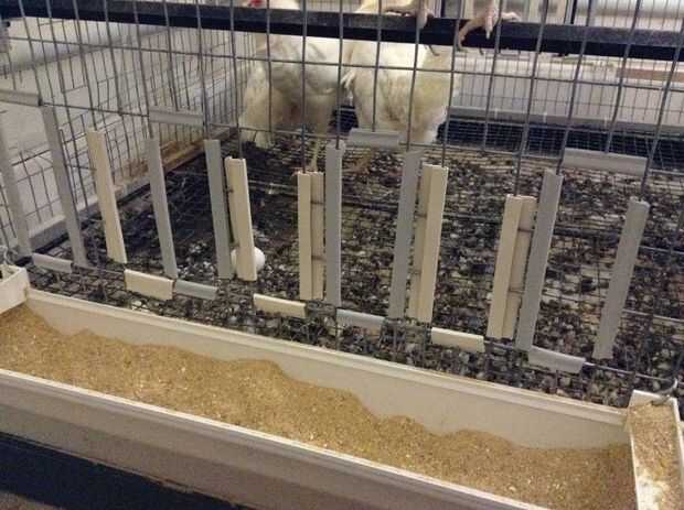 Tiene que haber un comedero en la jaula. Puedes ver en la imagen cómo se coloca el comedero en la jaula. Las ranuras son dos pulgadas de ancho y seis pulgadas de alto. Tiene que haber suficientes ranuras para todos los pollos a comer al mismo tiempo. Si un pollo se va a comer otros quieren comer. El alimentador debe ser de cinco pulgadas de la parte inferior de la jaula. El alimentador debe tener cierres Unidos a él por lo que debe adjuntar fácilmente a la jaula.
