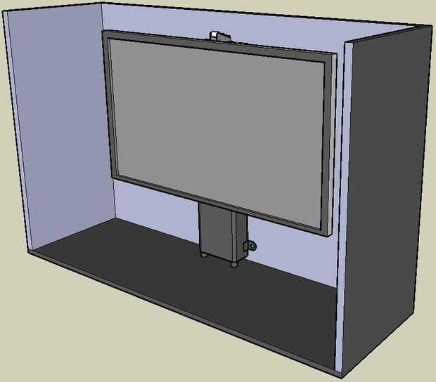 Ahora añadir los lados del gabinete y la tv. Nota ajustar la posición de la tv sobre el mecanismo de elevación usando los diferentes orificios en el soporte de elevación TV. Necesita colocar el TV de manera que idealmente la parte superior de la TV se encuentra justo debajo de los rodillos en la parte superior del mecanismo de la TV. Esto es para que cuando la TV es levantar los rodillos que empujan la tapa abierta y no la TV.