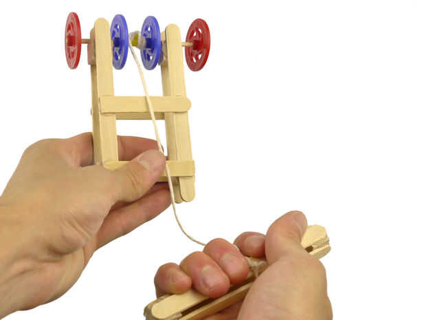 1. Enganchar el gancho del cable de tracción sobre las ruedas. Permita que la manija del tirón de cuerda que cuelgan de las ruedas y sus manos al viento para arriba. El peso del mango mantiene la cadena enseñada como se hiere para arriba. Si se hiere para arriba demasiado floja, puede enredarse cuando se utiliza.