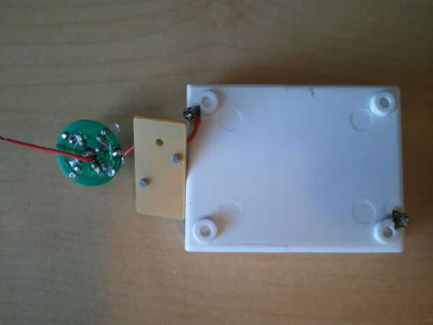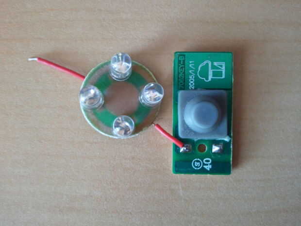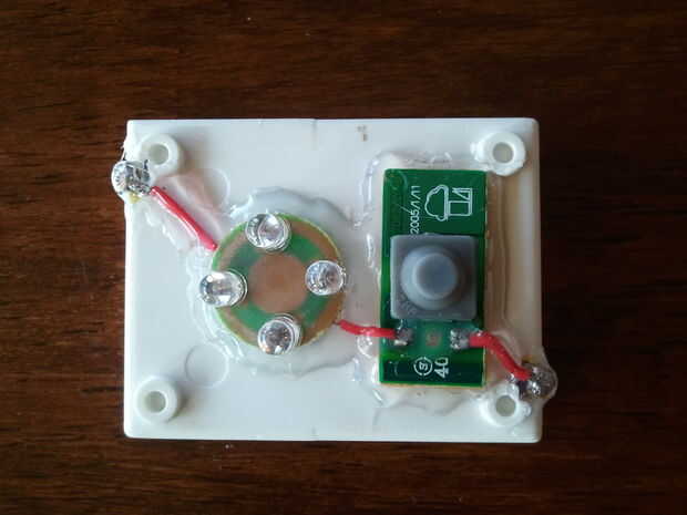 El cambio de las pilas y el LED de la soldadura. Elegí un interruptor de botón para evitar que a mis hijos salgan a la luz en este interruptor requiere una presión constante para permanecer en. Posicionamiento del interruptor no es importante siempre y cuando se rompe el circuito.